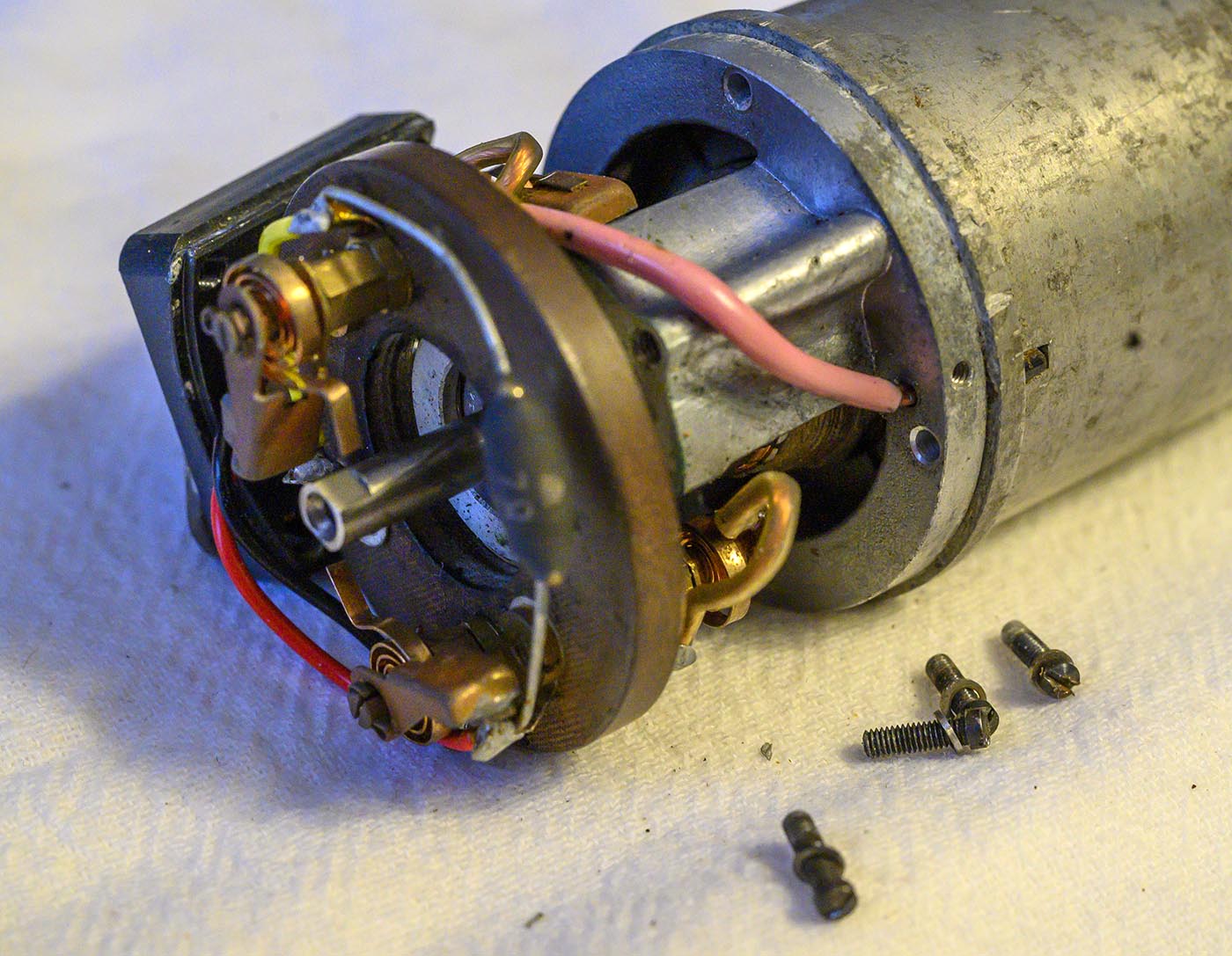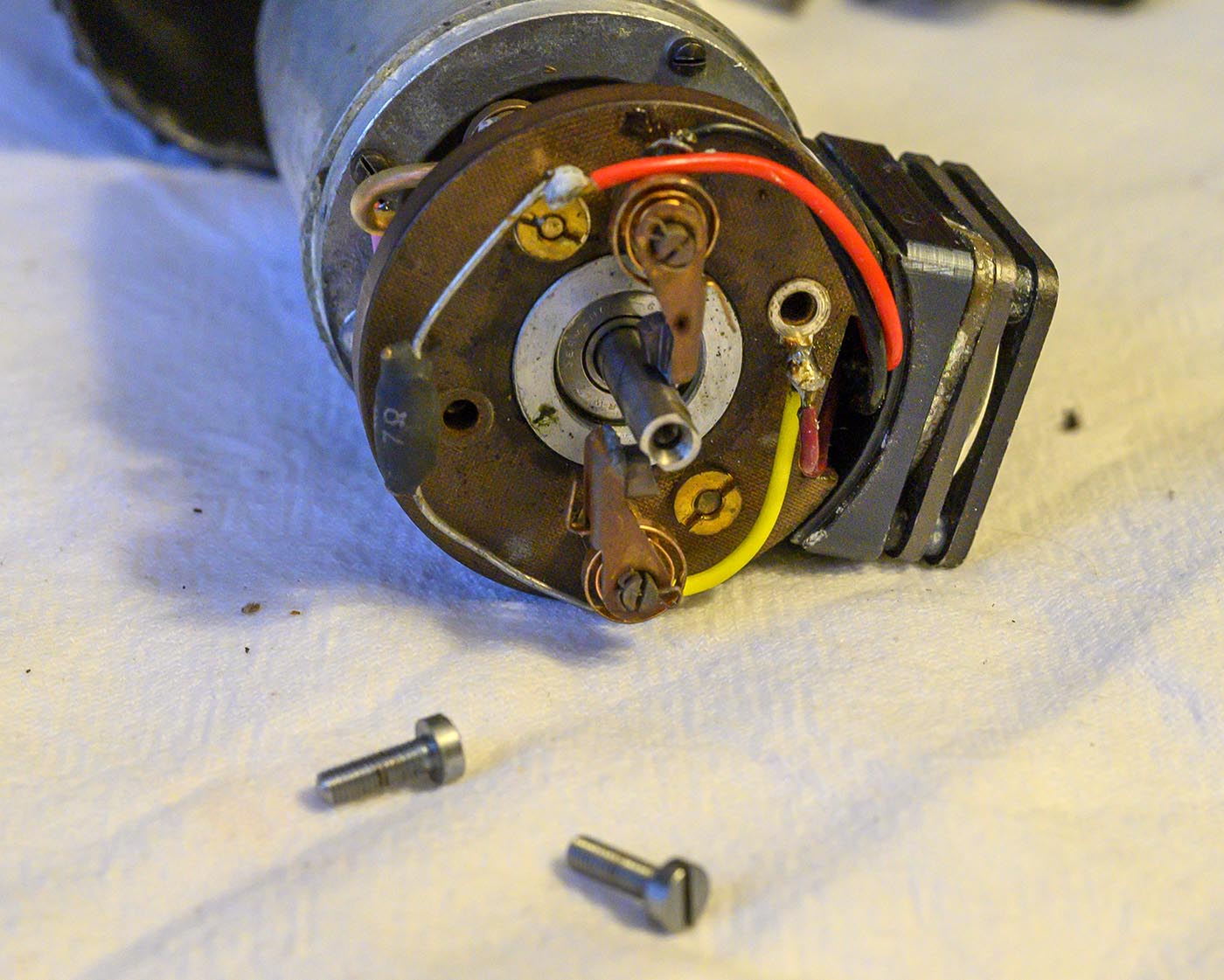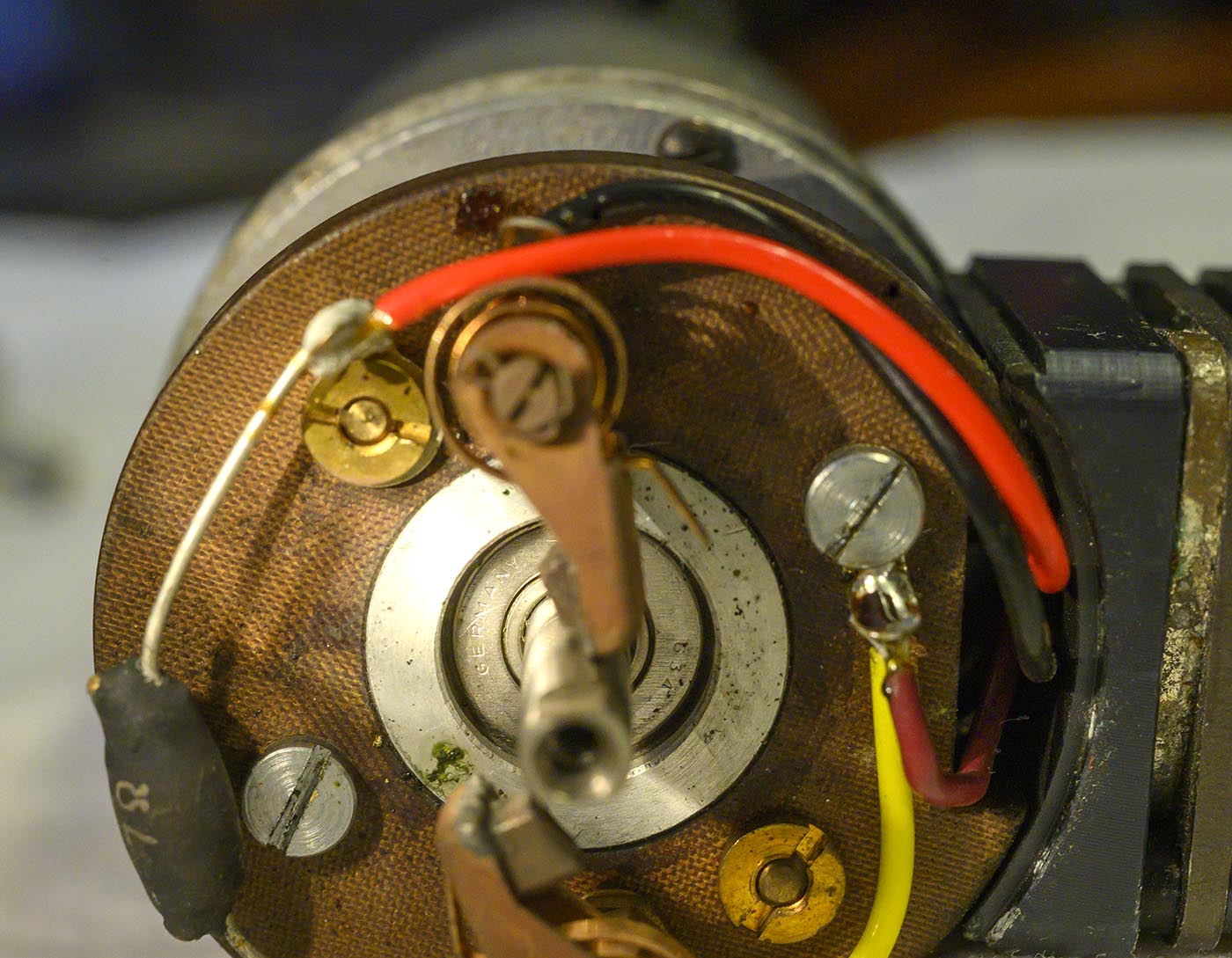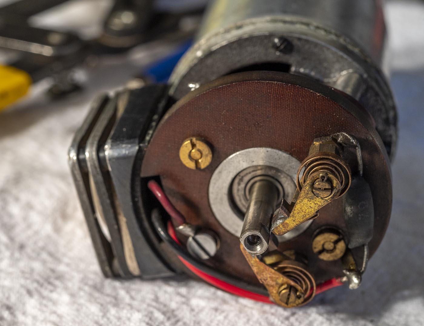 then extracted the bakelite plate off the end cap, which then would have gotten us a clearer shot at those 4 screws that hold the end cap on. Then pull the end cap off.