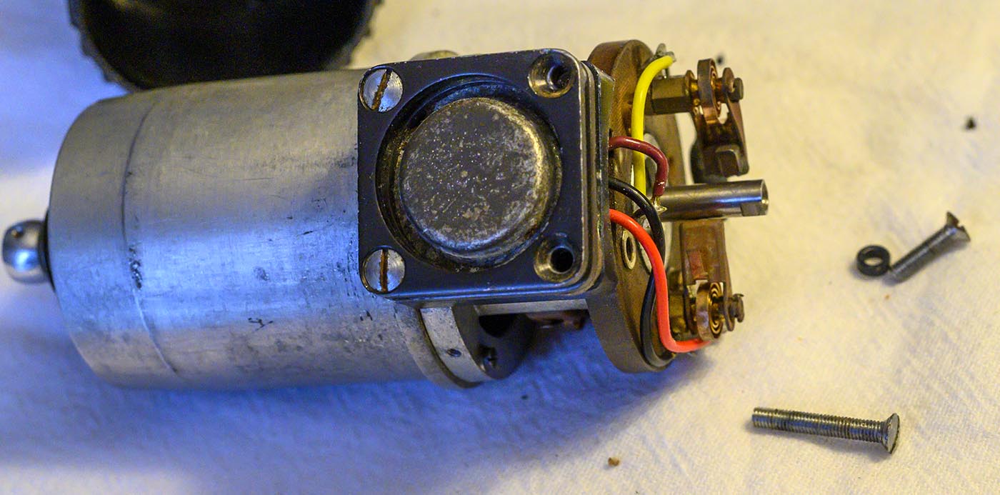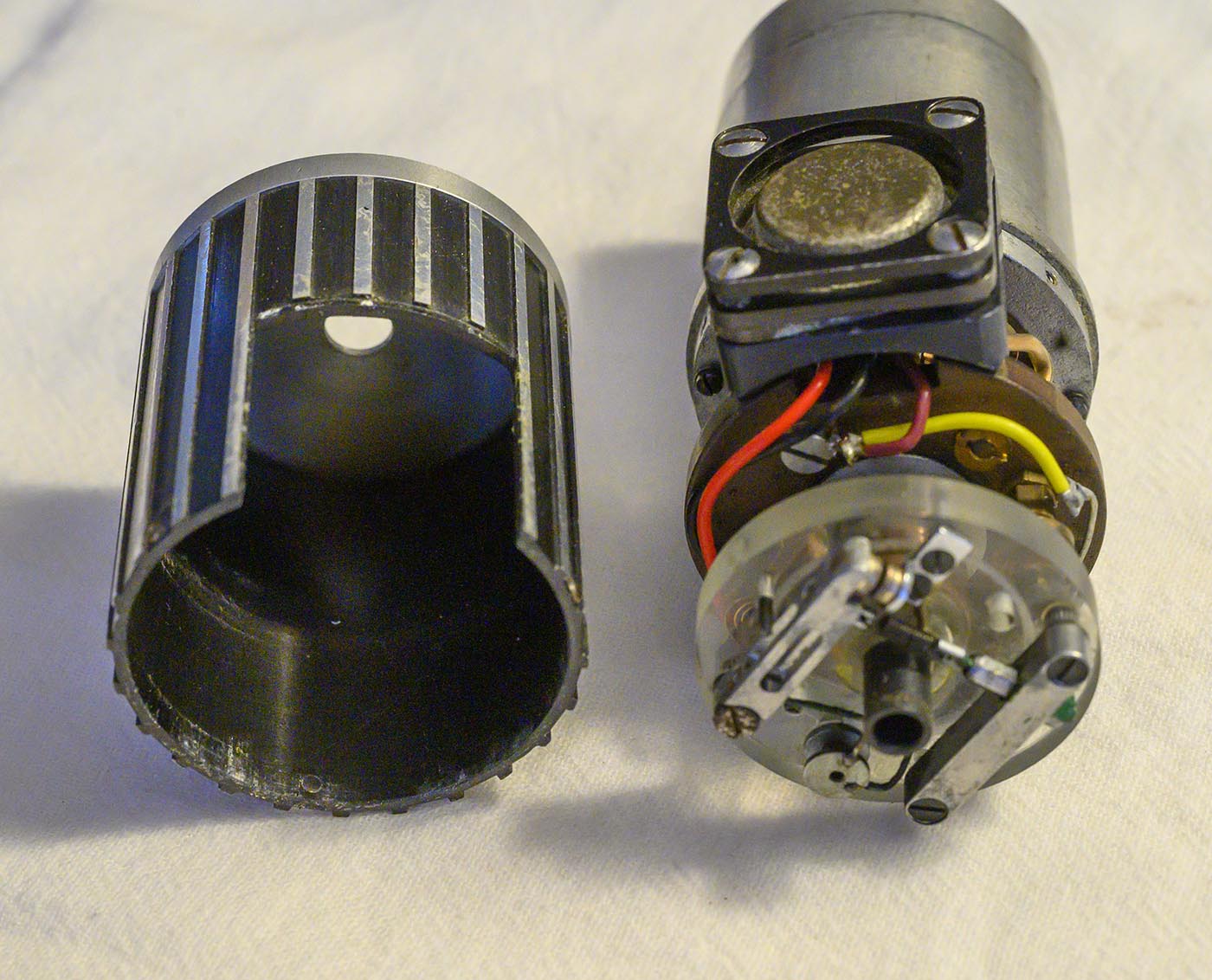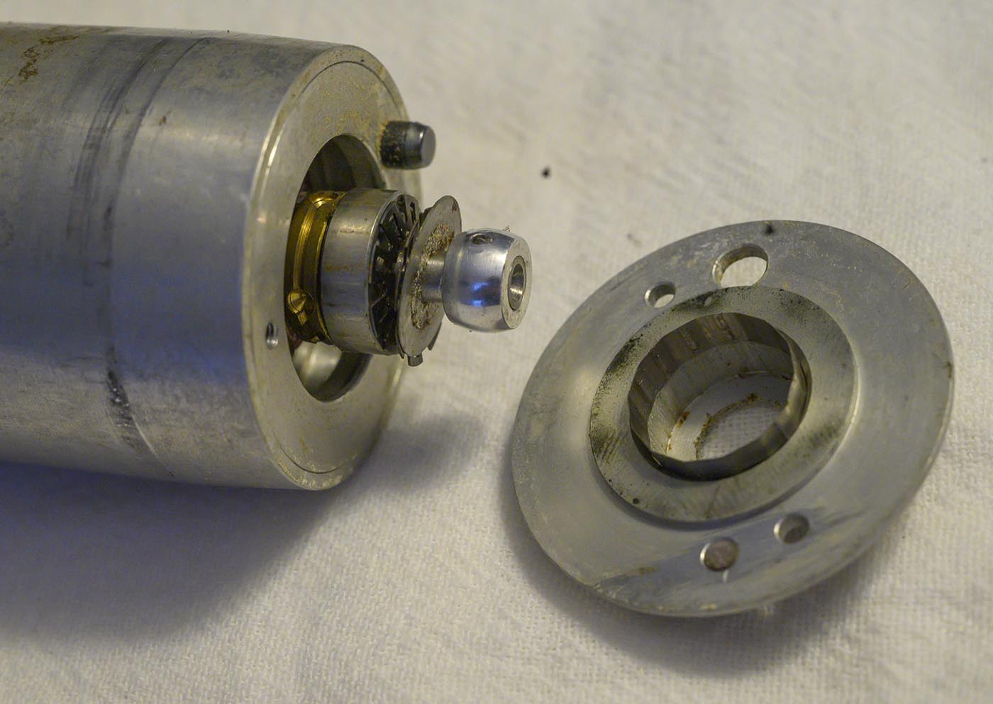 then extracted the bakelite plate off the end cap, which then would have gotten us a clearer shot at those 4 screws that hold the end cap on. Then pull the end cap off.