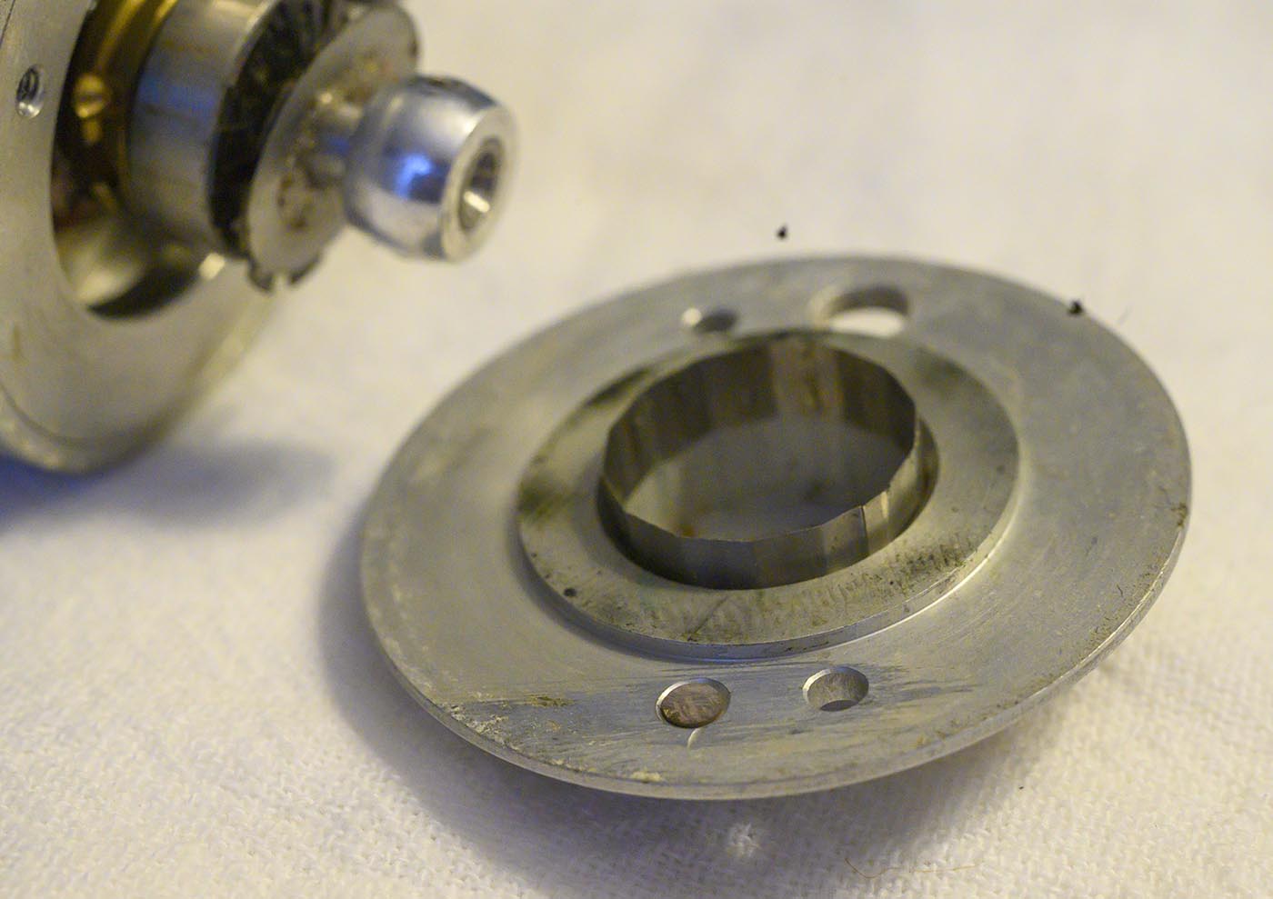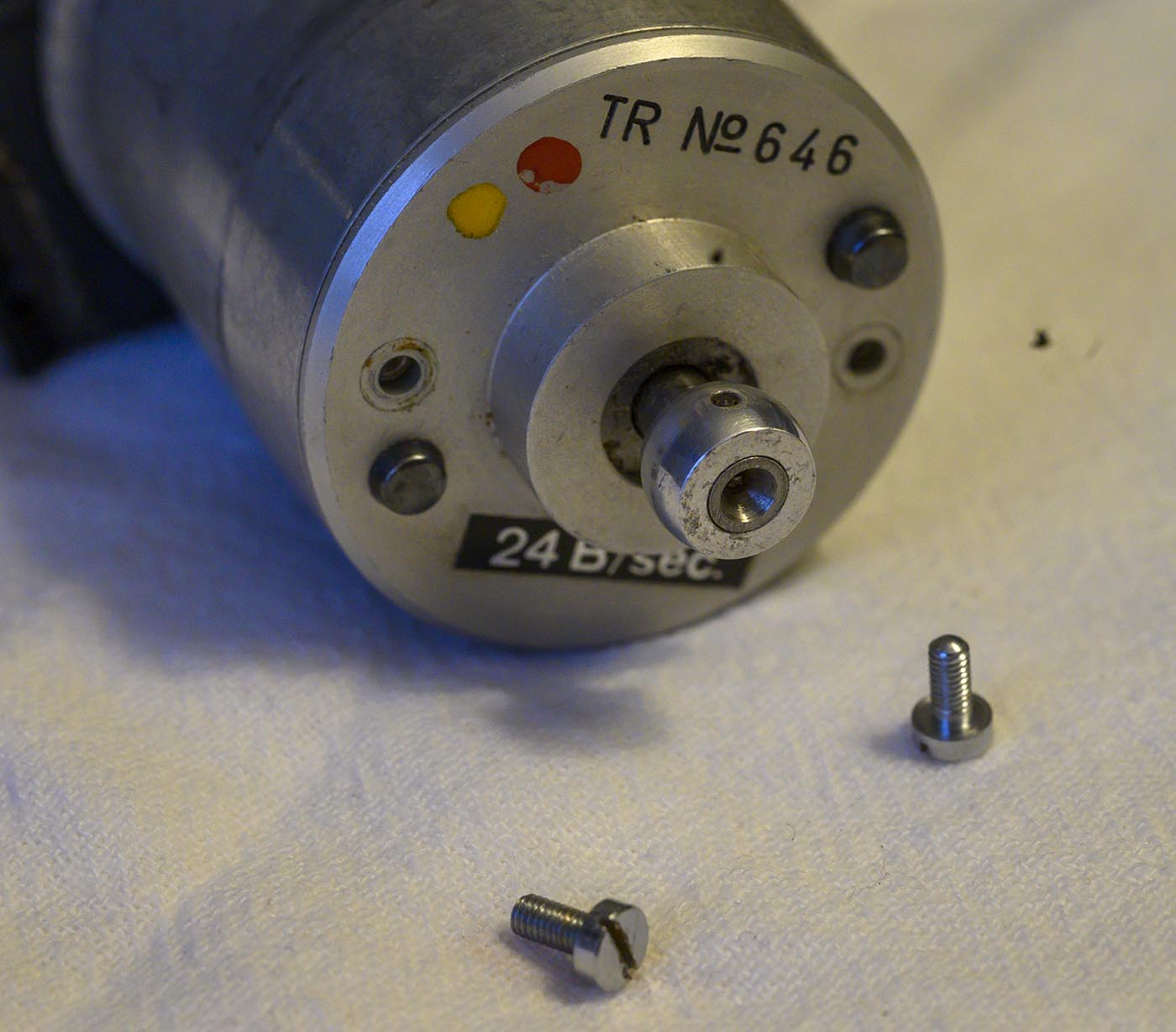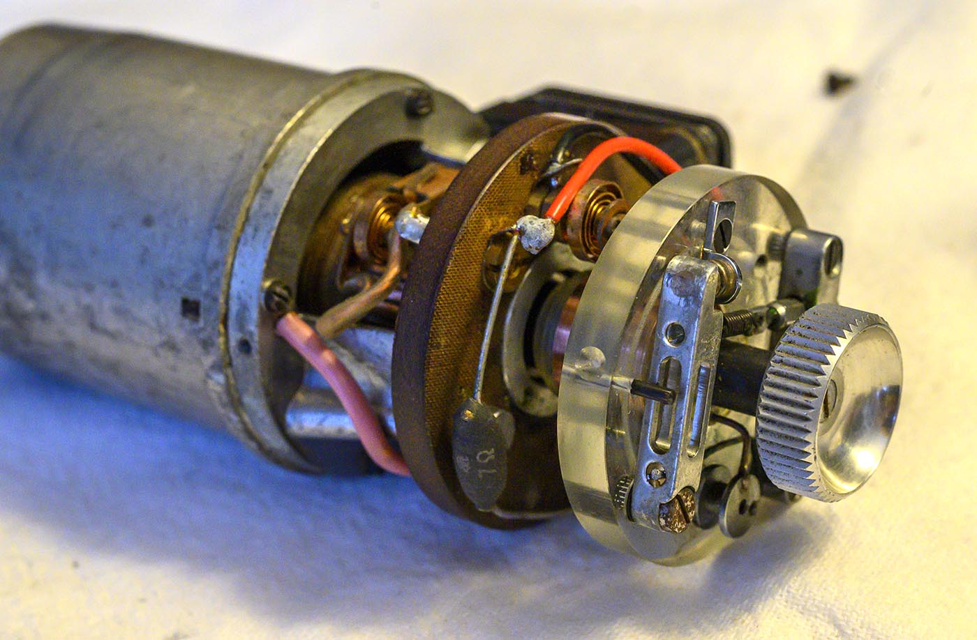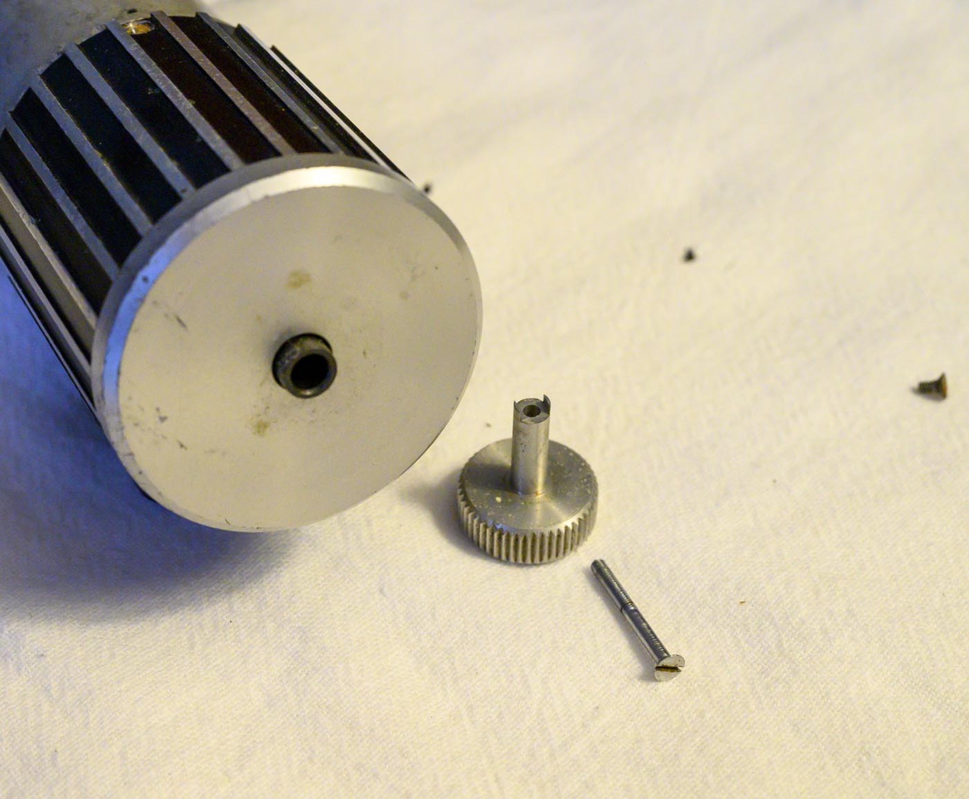 then extracted the bakelite plate off the end cap, which then would have gotten us a clearer shot at those 4 screws that hold the end cap on. Then pull the end cap off.