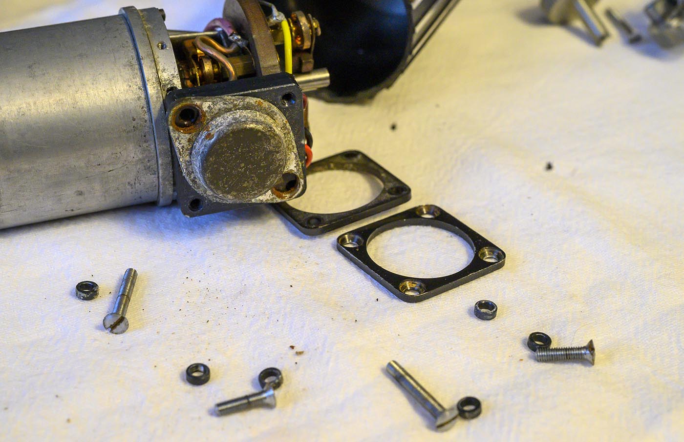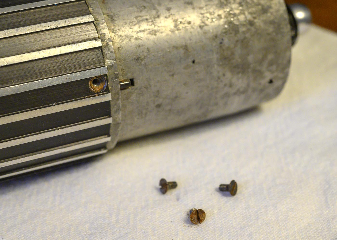 Next I took out the 4 little screws that seemed to hold the rear mounting plate structure to main body of the motor. This would have been easier if I had removed the Bakelite plate