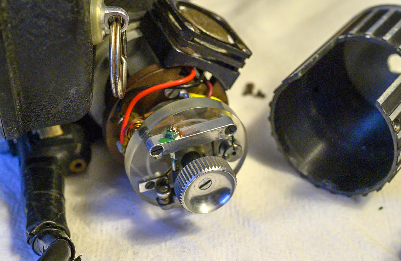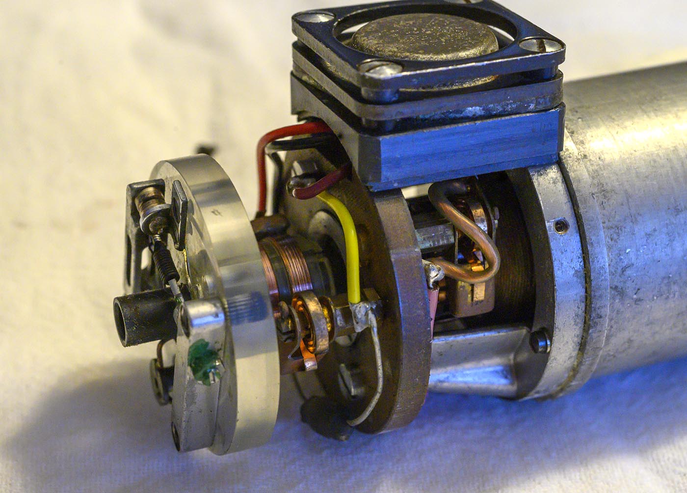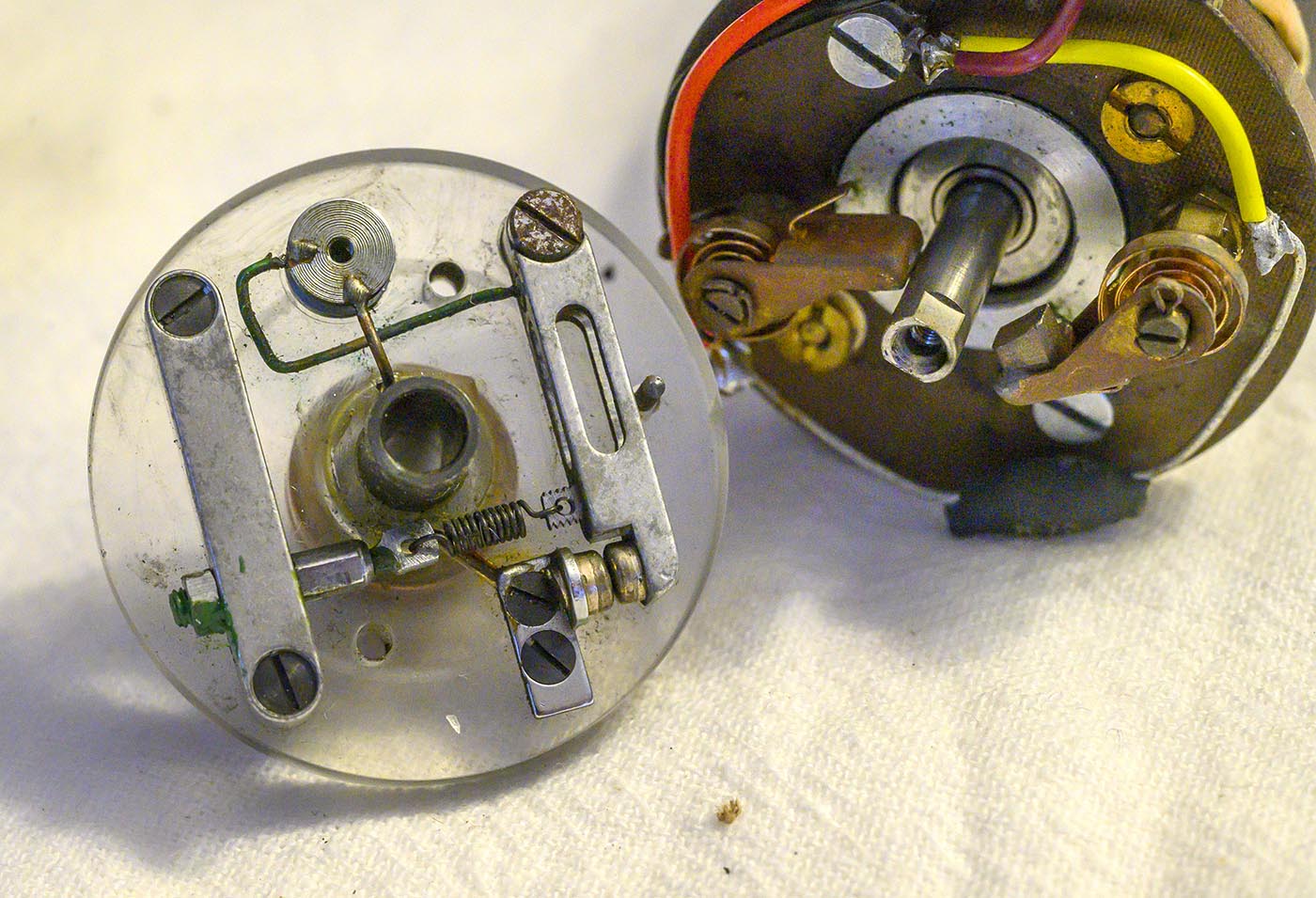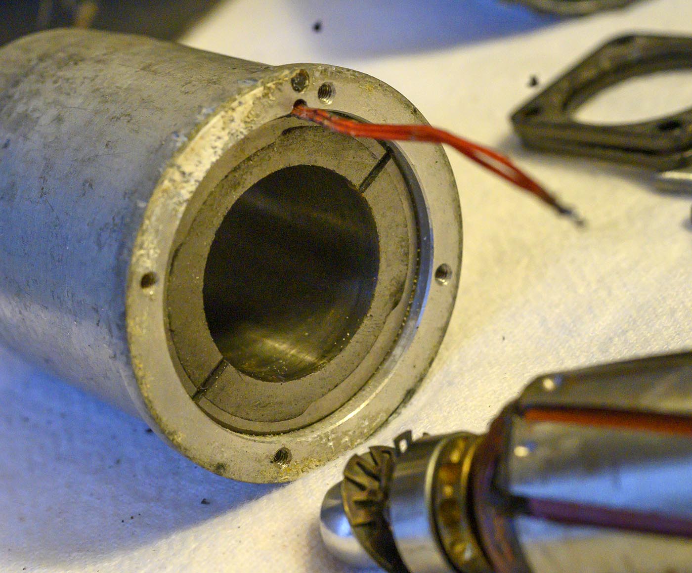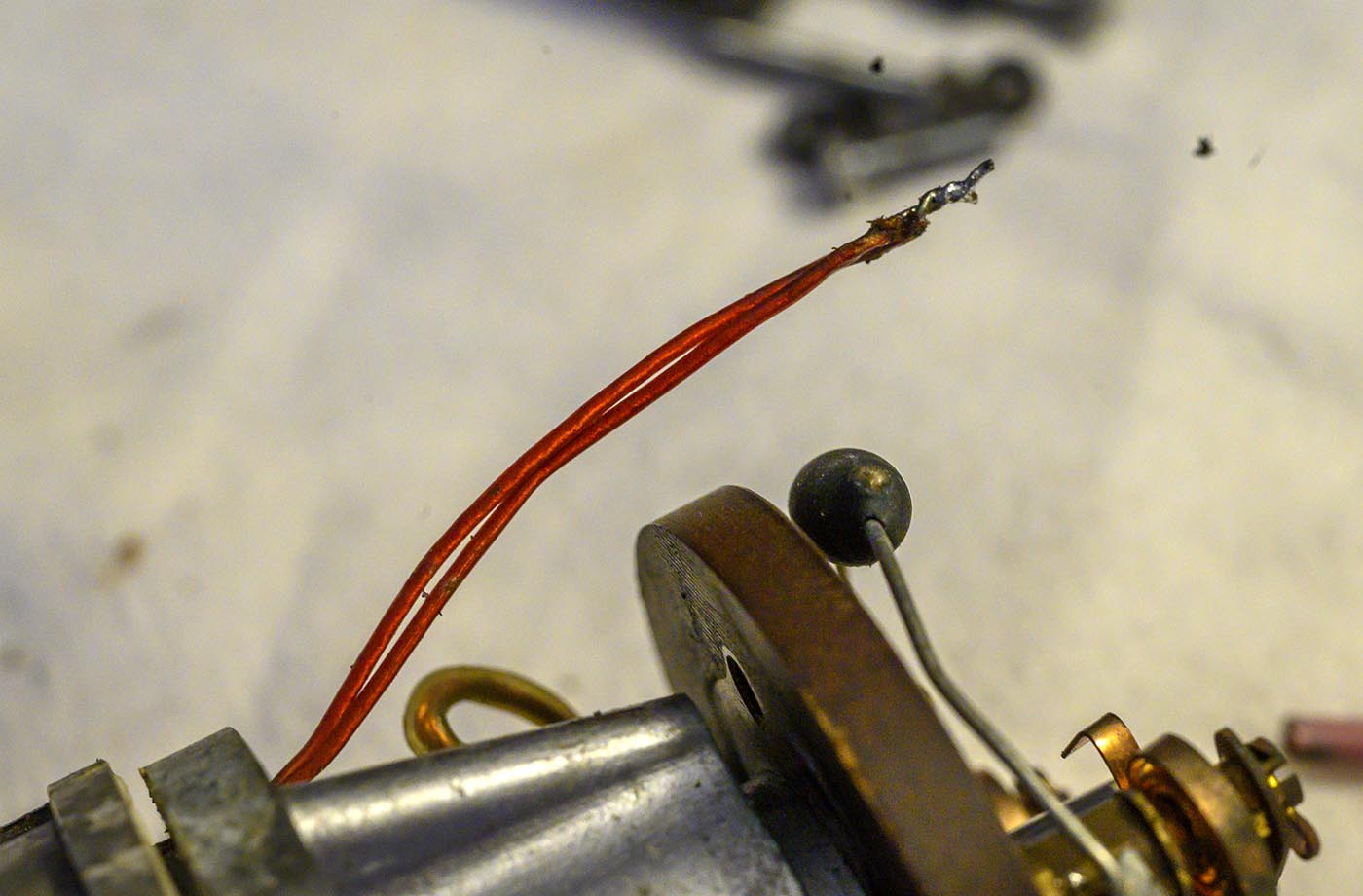 Now we can VERY carefully pull the end cap and bakelite plate and armature away from the main body, as we thread that pair of wires back through the hole in the end cap.