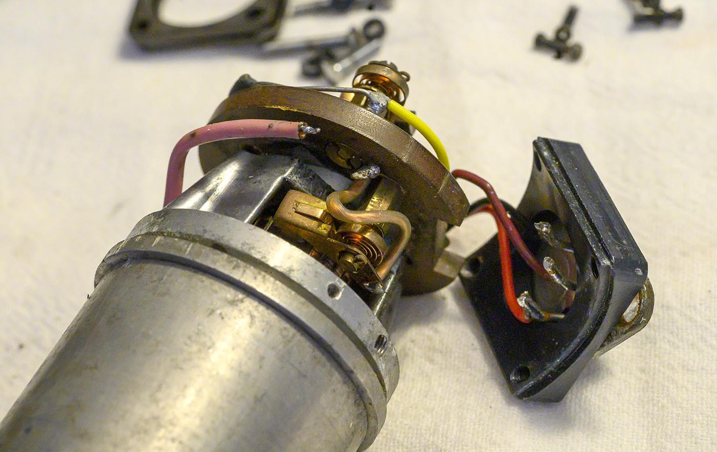 Now we can pull the brushes back and get the whole bakelite mounting plate around and off from the end cap. In retrospect we should have desoldered the pink wire,