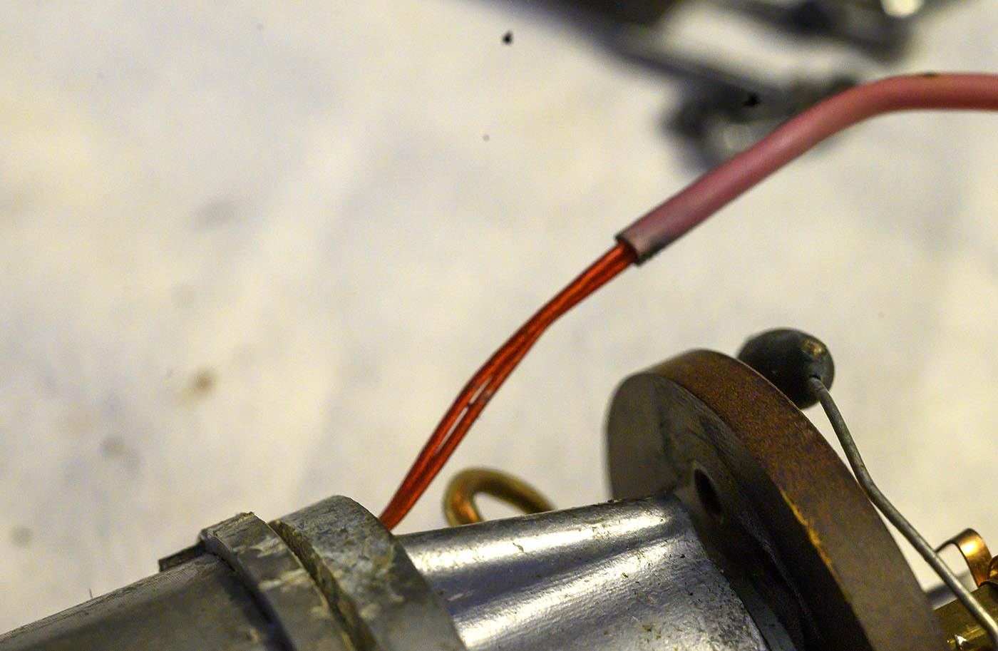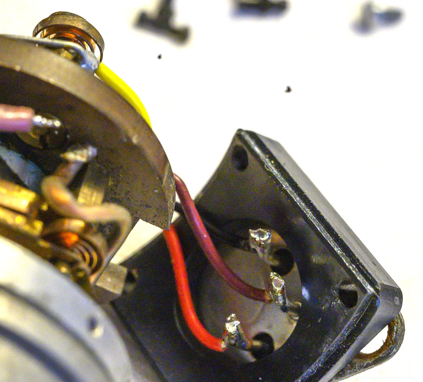 We need to start by desoldering the pink wire from the brush wire mounting lug (the one under the yellow wire).