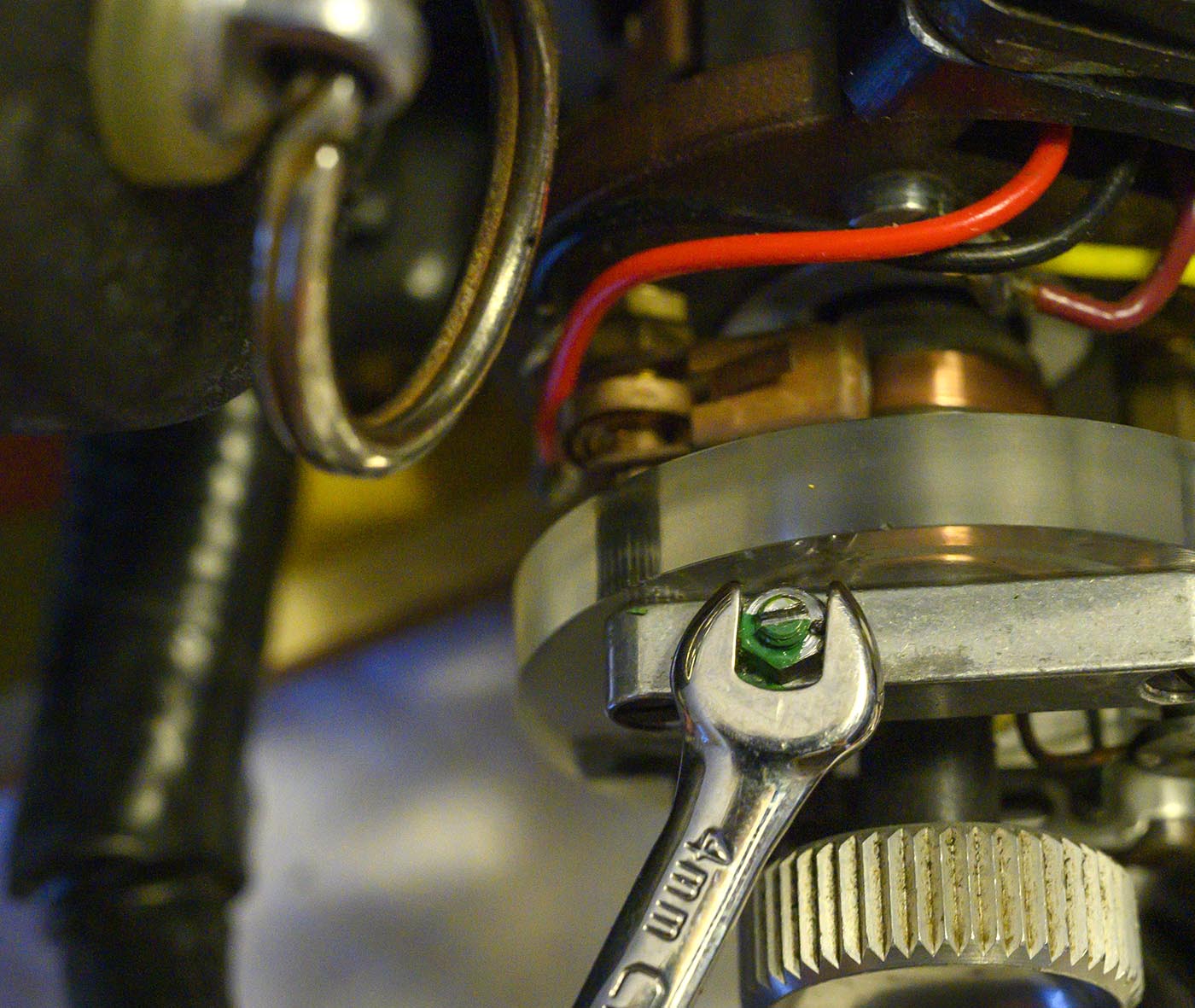 Here is the adjustment screw, and the 4mm wrench you'll need to loosen the locknut to adjust it (along with a small flatblade screwdriver.) If you've ever adjusted